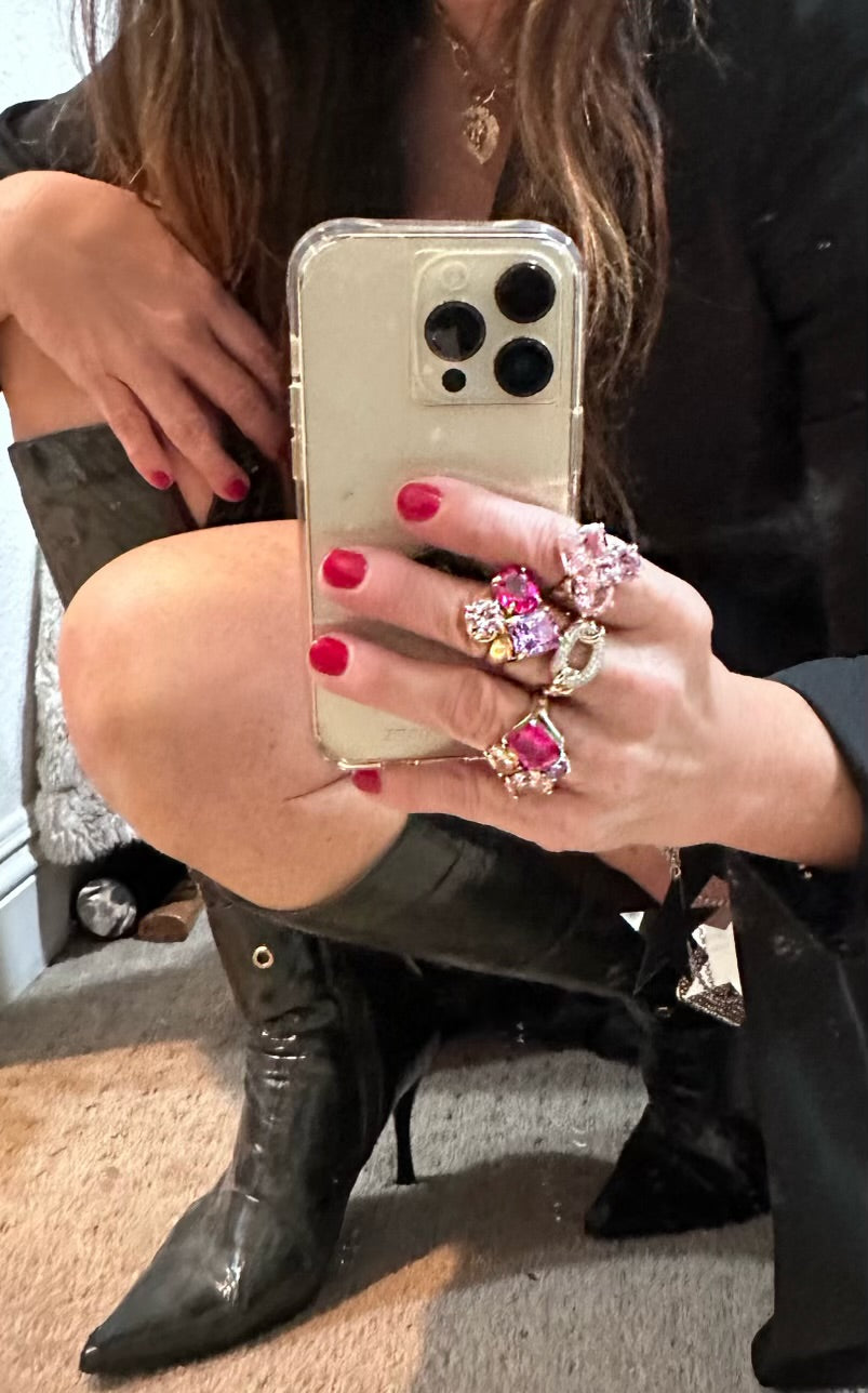 The Trifecta Collection is crafted from Sterling Silver or “Fools Gold” and set with three symbolic glass crystals. Each distinct stone has meaning and intention. We have over a dozen combinations to empower you. Champagne (Clarity), Blossom-Light Pink (Limitless Love), Cosmo-Lavender (Intuition), Dahlia-Magenta (Curiosity), Indigo-Purple (Good Fortune), Azure-Blue (Connection), Poppy-Orange (Courage), Scarlet-Red (Protection), Lime-Peridot (Abundance), Canary-Yellow (Euphoria)